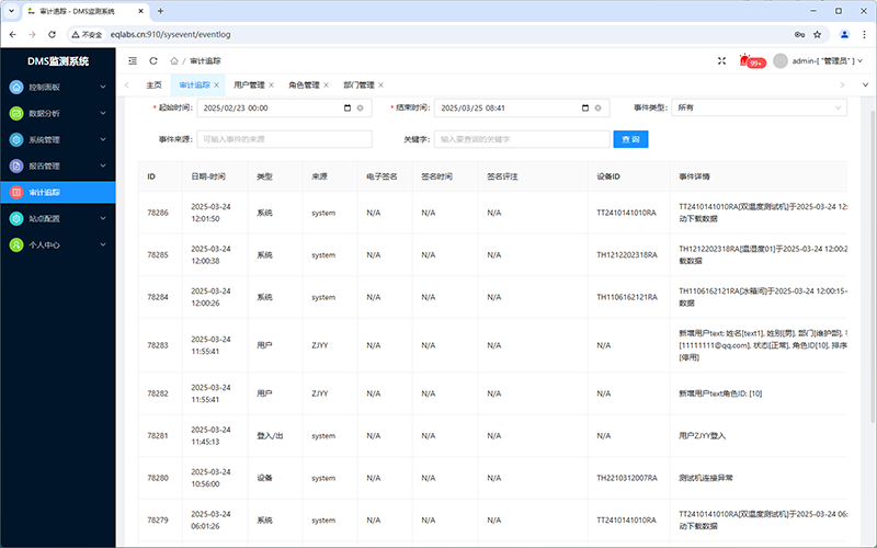 审计追踪:记录所有用户操作,数据增删改查及系统事件,支持事件类型、来源查询并支持关键字模糊查询。